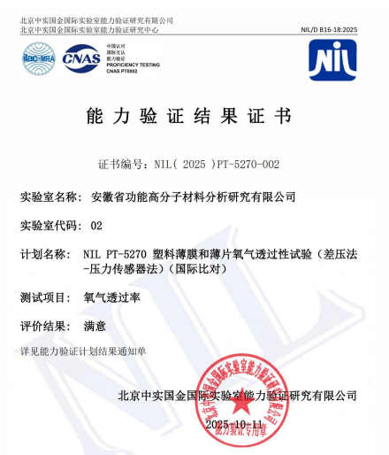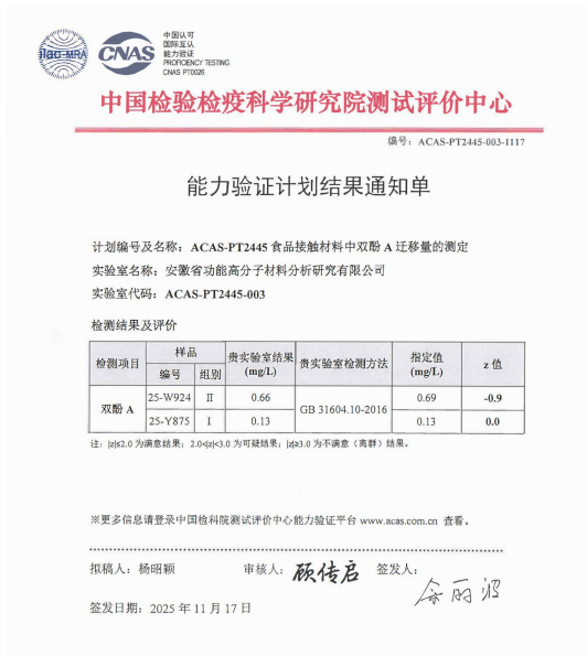 2025年,国家高分子材料质量检验检测中心(安徽)高质量完成全年实验室质量控制计划,其中能力验证作为核心组成部分,参评的26个项目全部获得“满意”结果(1项待正式公布),实现近乎“全优”的优异成绩,充分体现了中心在检测全过程中的规范管理、精准操作和可靠技术能力。
