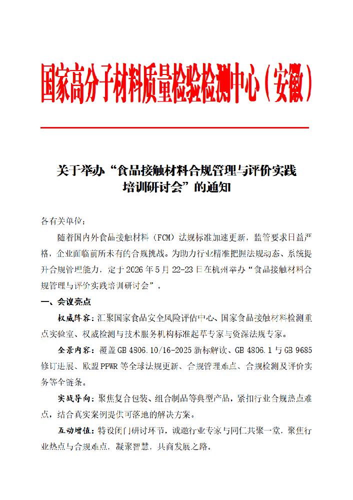 - 关于举办“食品接触材料合规管理与评价实践培训研讨会”的通知